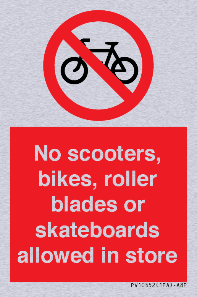 No scooters, bikes, roller blades or skateboards allowed in store Sign