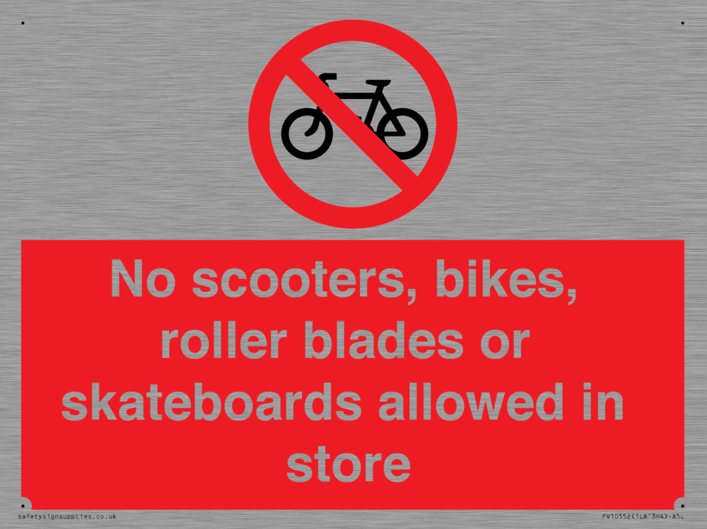 No scooters, bikes, roller blades or skateboards allowed in store Sign