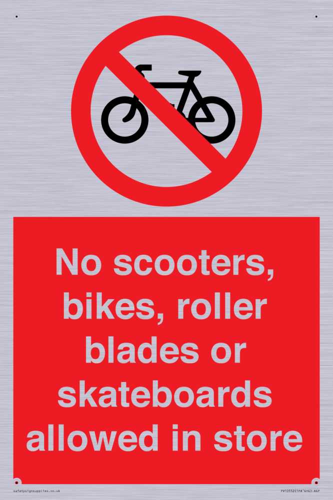 No scooters, bikes, roller blades or skateboards allowed in store Sign