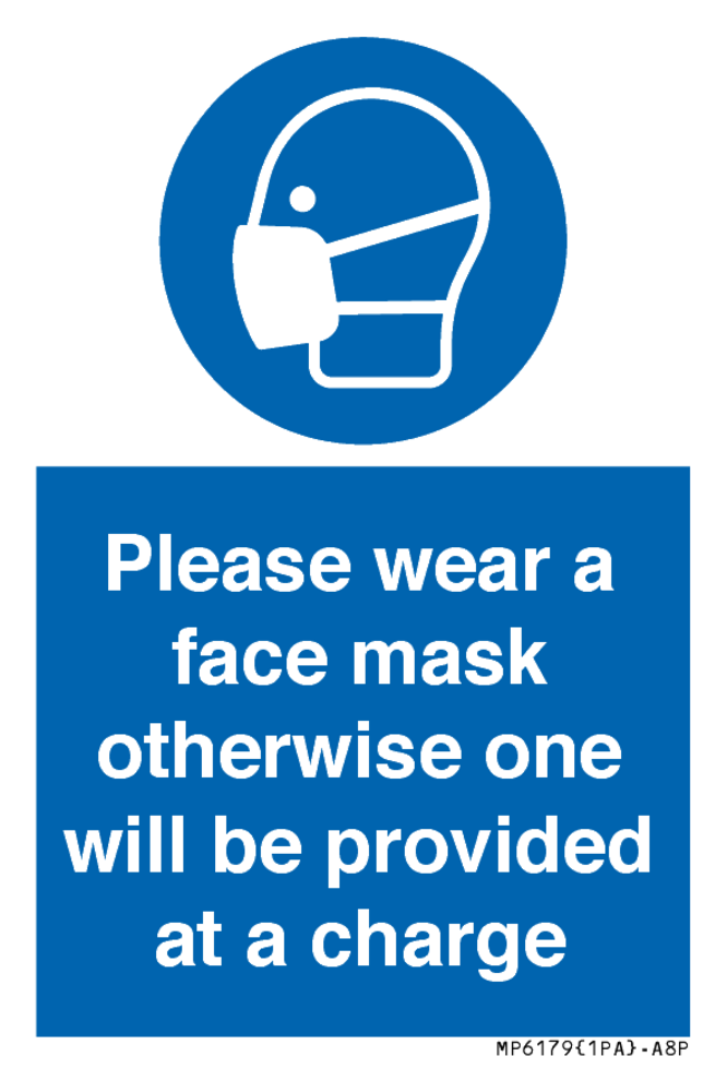 Please wear a face mask otherwise one will be provided at a charge Sign