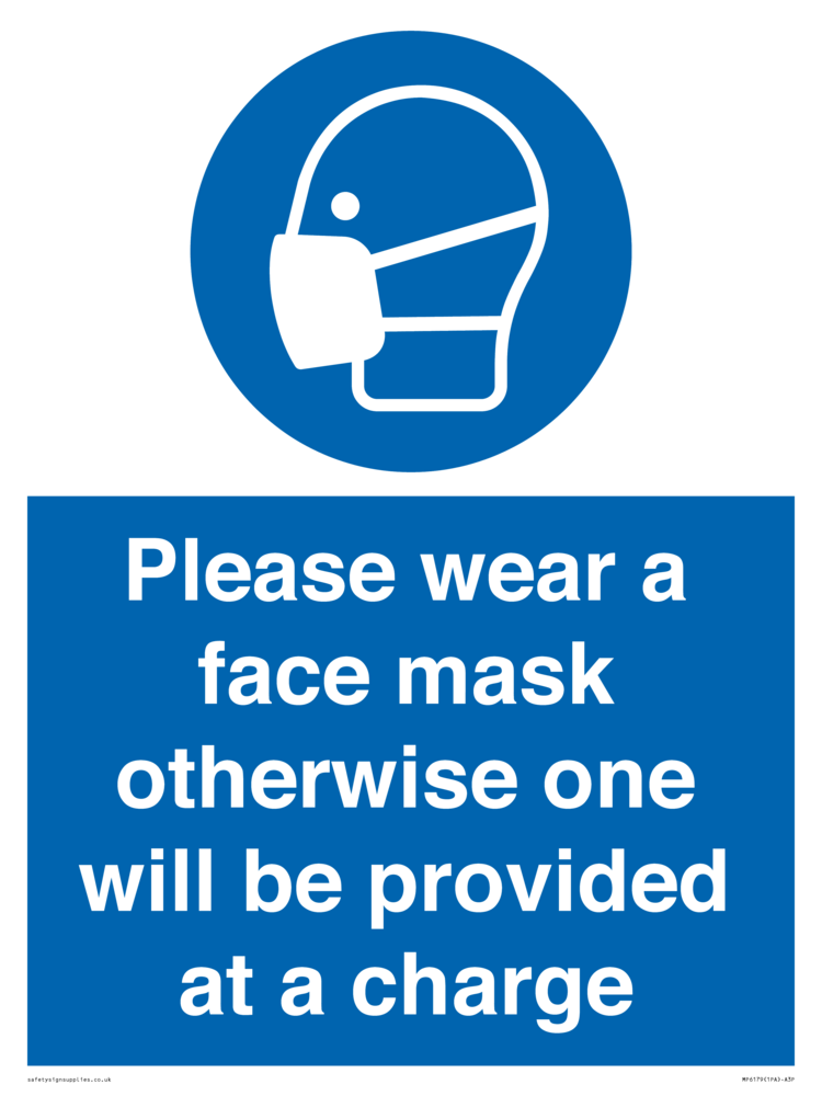 Please wear a face mask otherwise one will be provided at a charge Sign