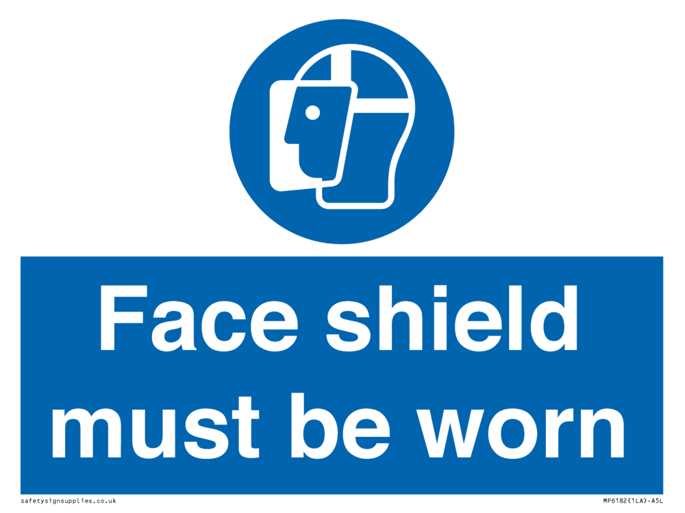 Image content: Human head (left-hand profile, outlined) wearing a face shield.
