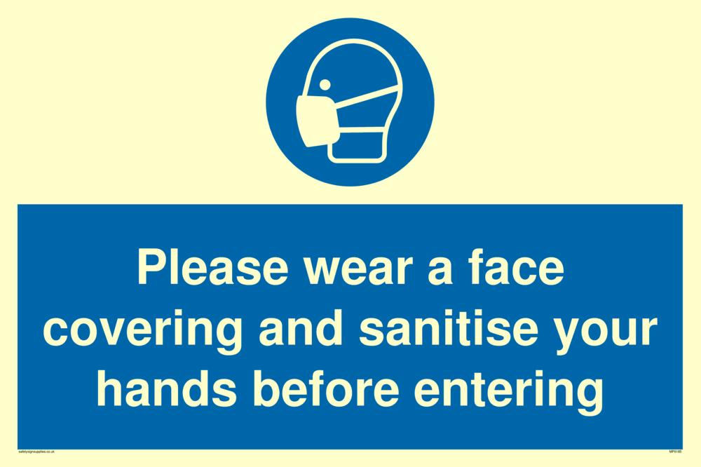 Please wear a face covering and sanitise your hands before entering Sign