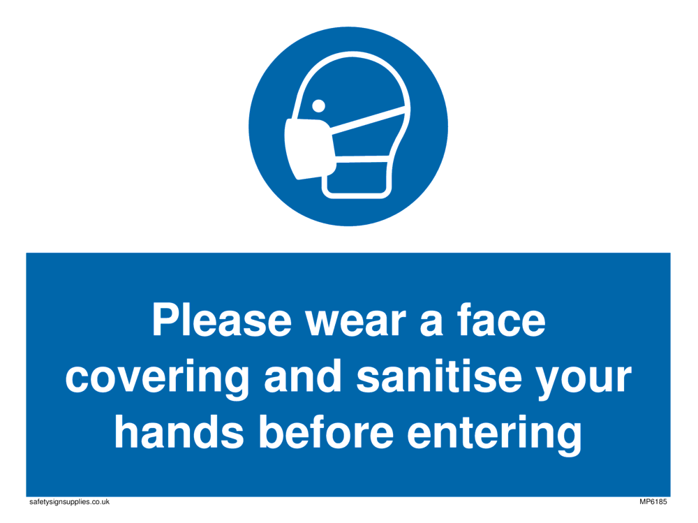 Please wear a face covering and sanitise your hands before entering Sign