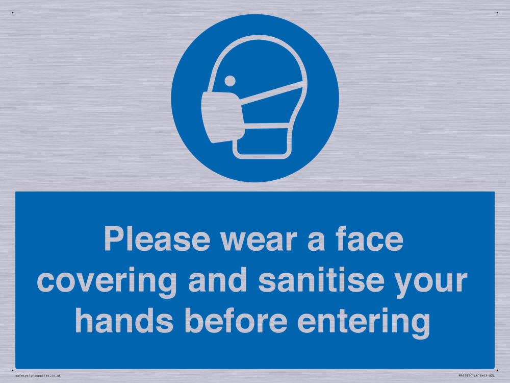 Please wear a face covering and sanitise your hands before entering Sign