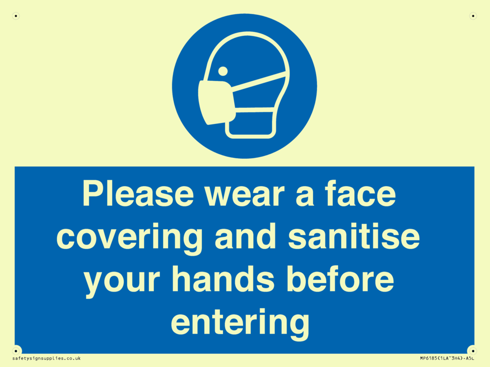 Please wear a face covering and sanitise your hands before entering Sign