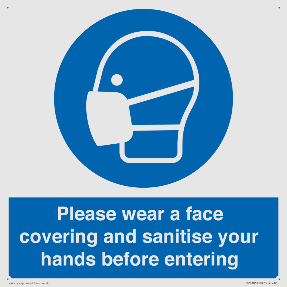 Please wear a face covering and sanitise your hands before entering Sign