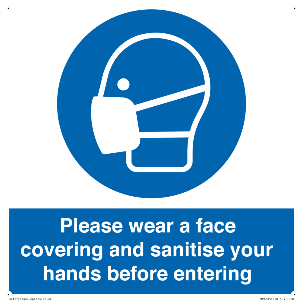 Please wear a face covering and sanitise your hands before entering Sign