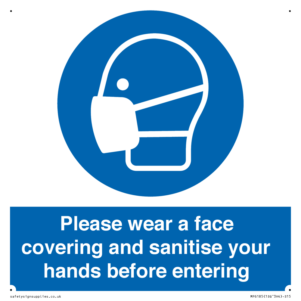 Please wear a face covering and sanitise your hands before entering Sign