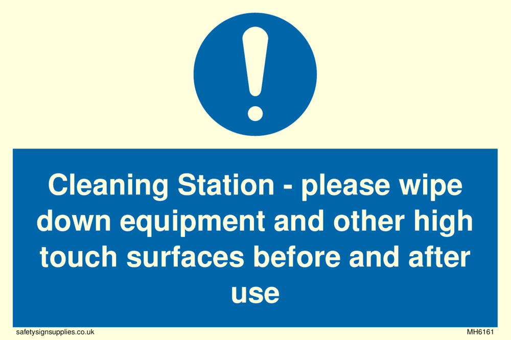 Sign Text: Cleaning Station - please wipe down equipment and other high touch surfaces before and after use
