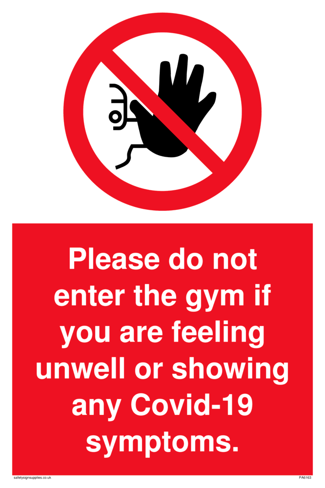 Sign Text: Please do not enter the gym if you are feeling unwell or showing any Covid-19 symptoms.