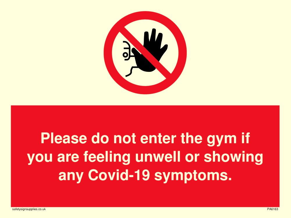 Sign Text: Please do not enter the gym if you are feeling unwell or showing any Covid-19 symptoms.