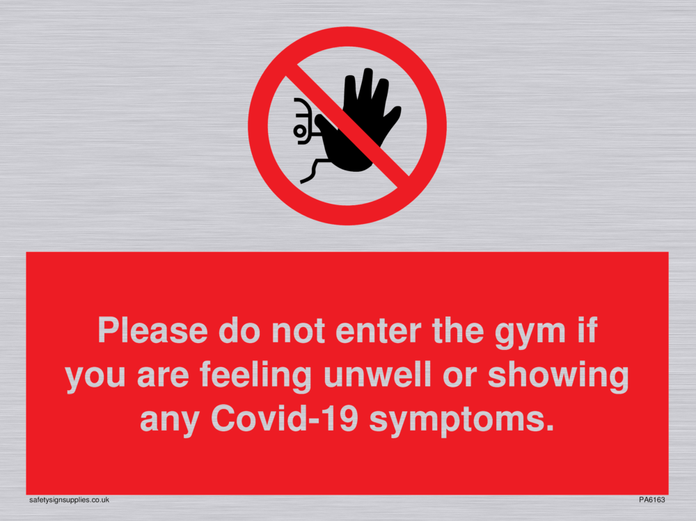 Sign Text: Please do not enter the gym if you are feeling unwell or showing any Covid-19 symptoms.