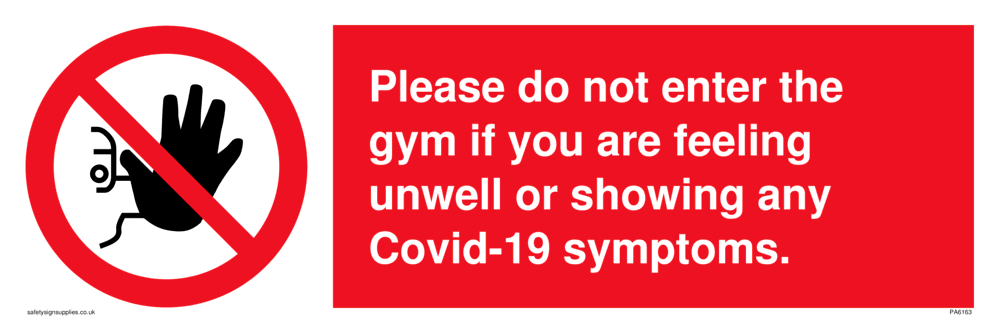 Sign Text: Please do not enter the gym if you are feeling unwell or showing any Covid-19 symptoms.
