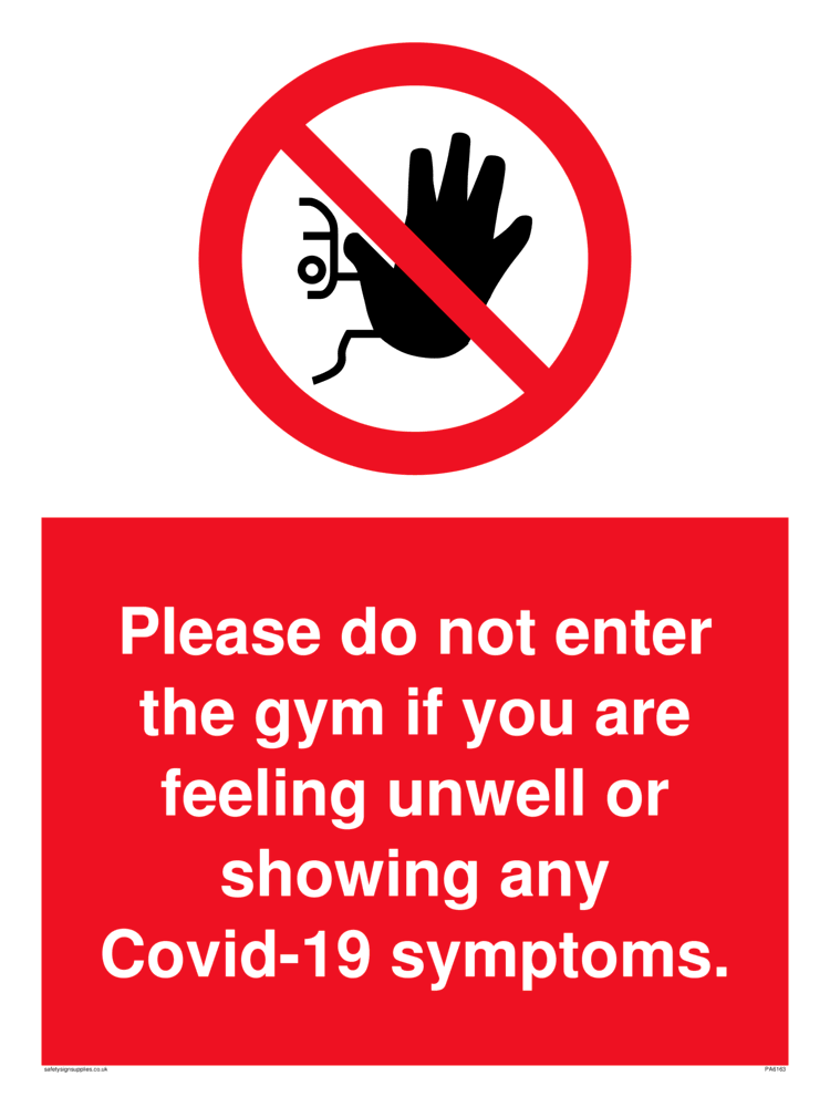 Sign Text: Please do not enter the gym if you are feeling unwell or showing any Covid-19 symptoms.