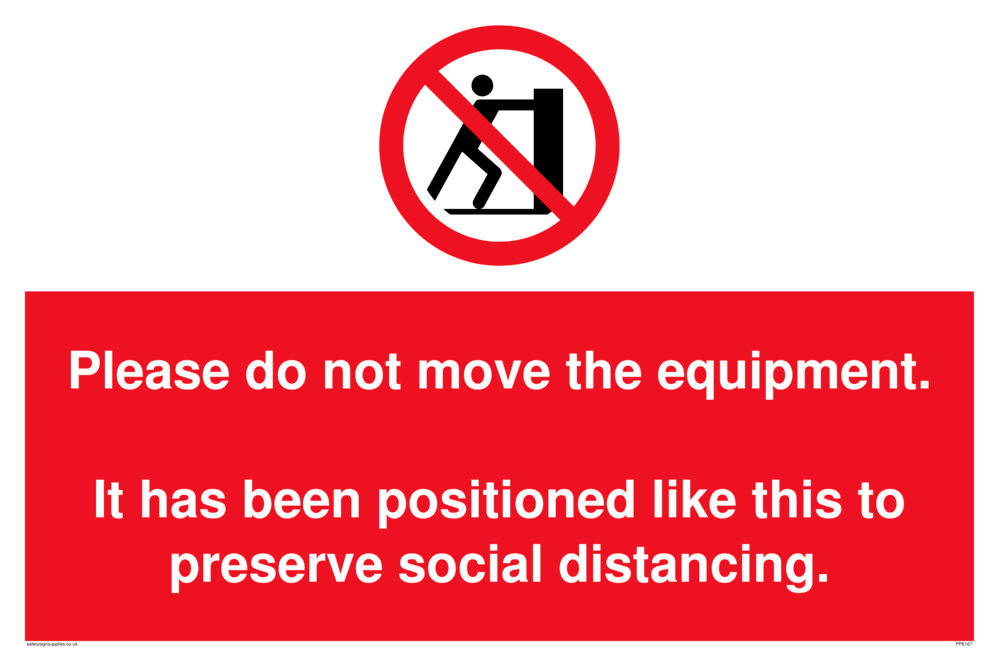 Sign Text: Please do not move the equipment. It has been positioned like this to preserve social distancing.