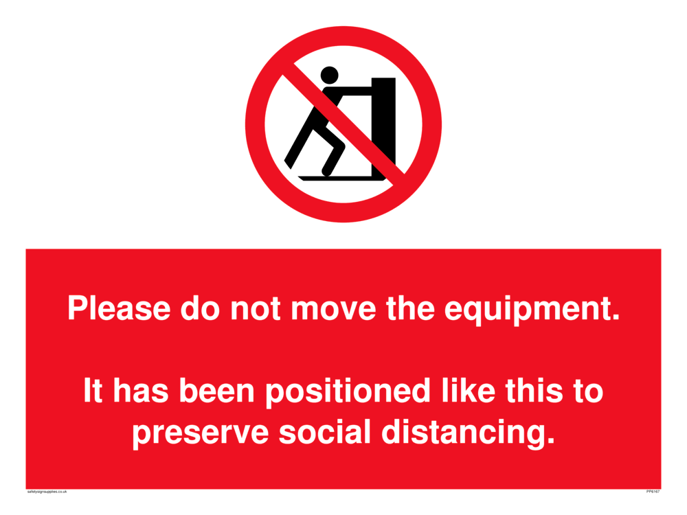 Sign Text: Please do not move the equipment. It has been positioned like this to preserve social distancing.