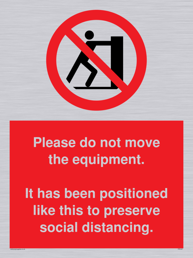 Sign Text: Please do not move the equipment. It has been positioned like this to preserve social distancing.