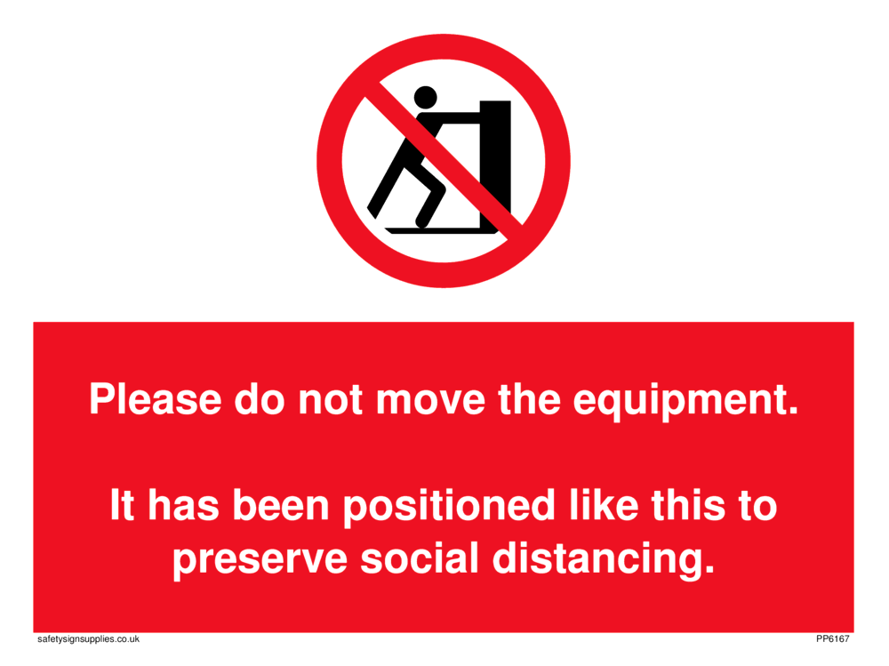 Sign Text: Please do not move the equipment. It has been positioned like this to preserve social distancing.