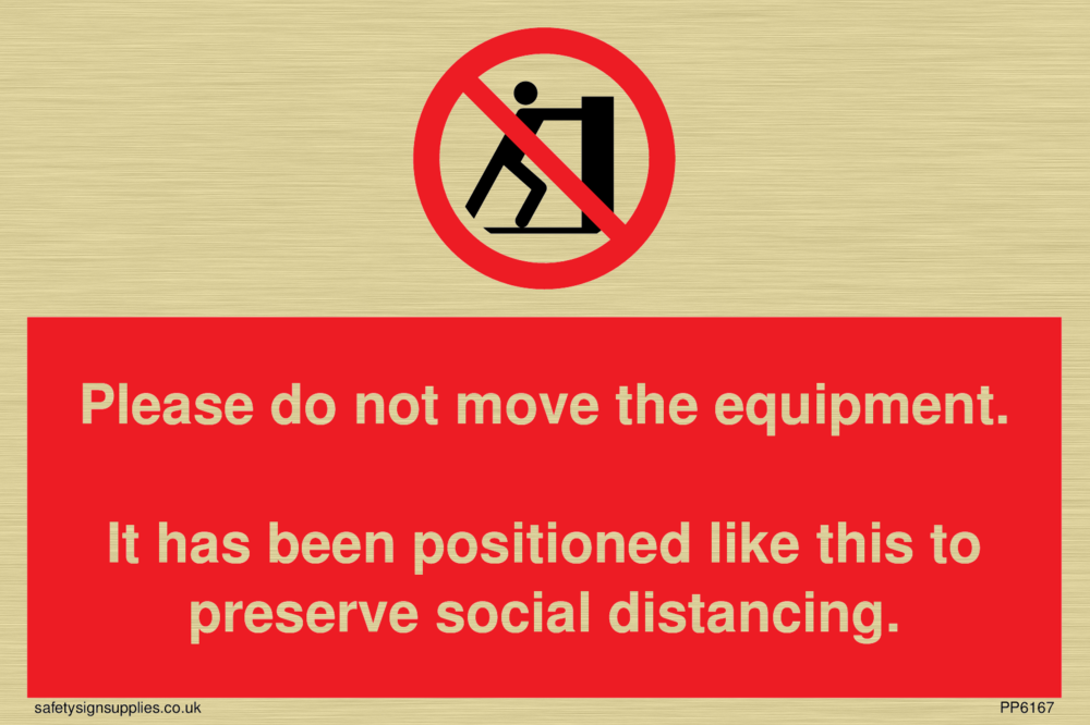 Sign Text: Please do not move the equipment. It has been positioned like this to preserve social distancing.