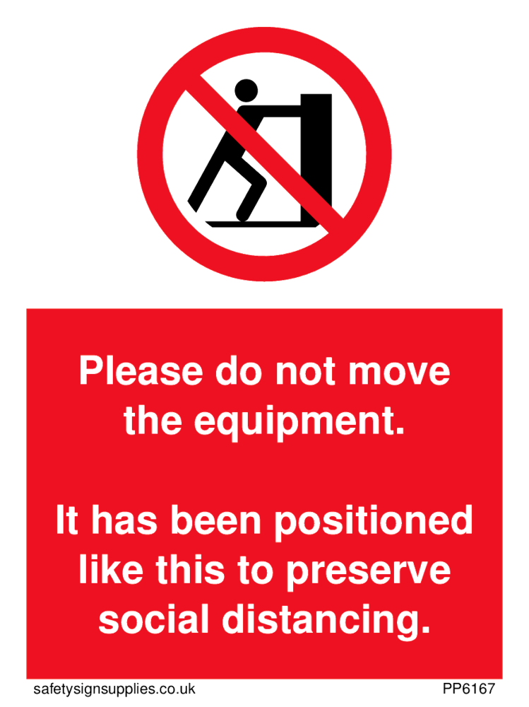 Sign Text: Please do not move the equipment. It has been positioned like this to preserve social distancing.