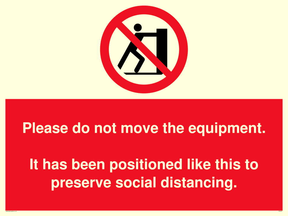 Sign Text: Please do not move the equipment. It has been positioned like this to preserve social distancing.