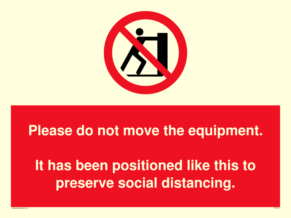 Sign Text: Please do not move the equipment. It has been positioned like this to preserve social distancing.
