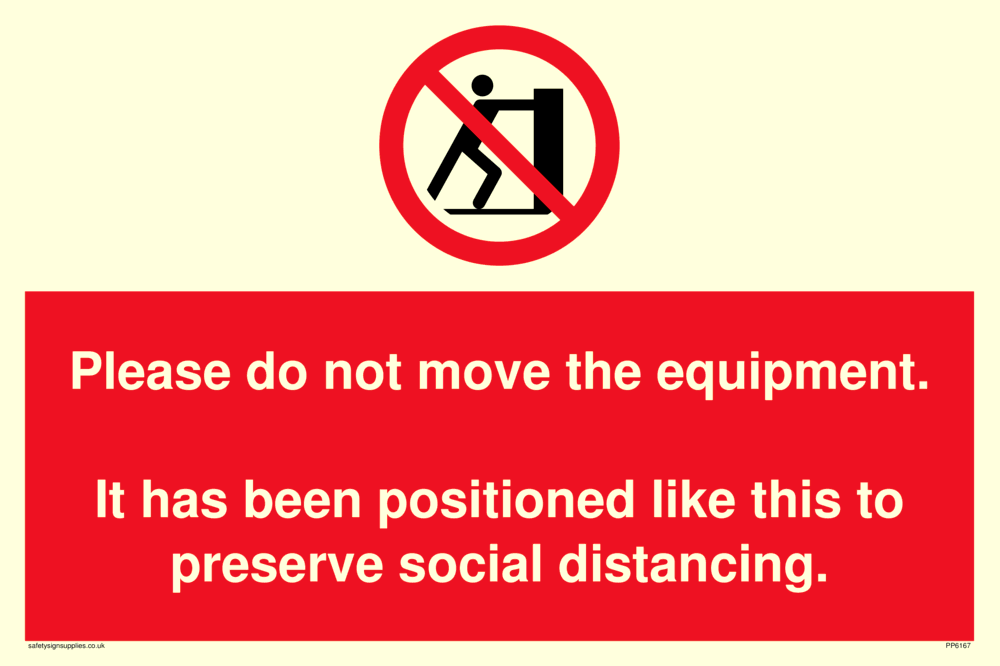 Sign Text: Please do not move the equipment. It has been positioned like this to preserve social distancing.