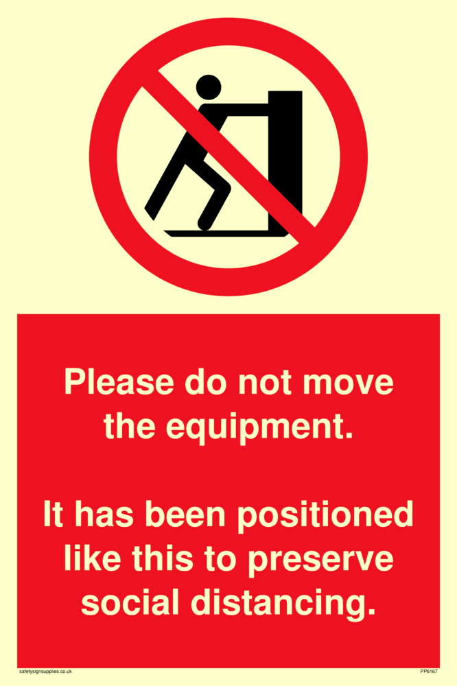 Sign Text: Please do not move the equipment. It has been positioned like this to preserve social distancing.