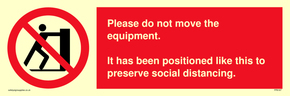 Sign Text: Please do not move the equipment. It has been positioned like this to preserve social distancing.