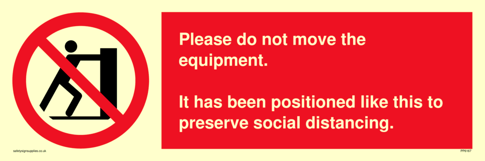 Sign Text: Please do not move the equipment. It has been positioned like this to preserve social distancing.