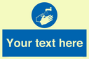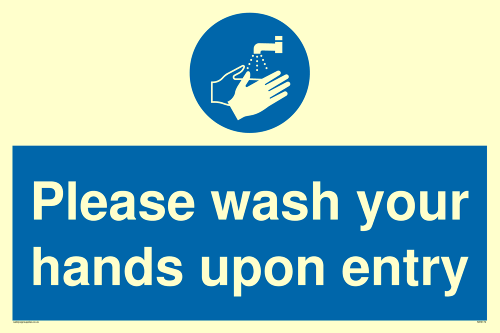 This sign contains a wash hands symbol - person washing hands under running tap in white within blue circle.