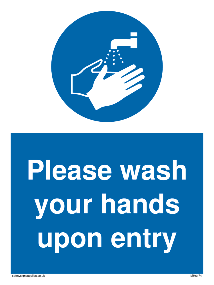 This sign contains a wash hands symbol - person washing hands under running tap in white within blue circle.