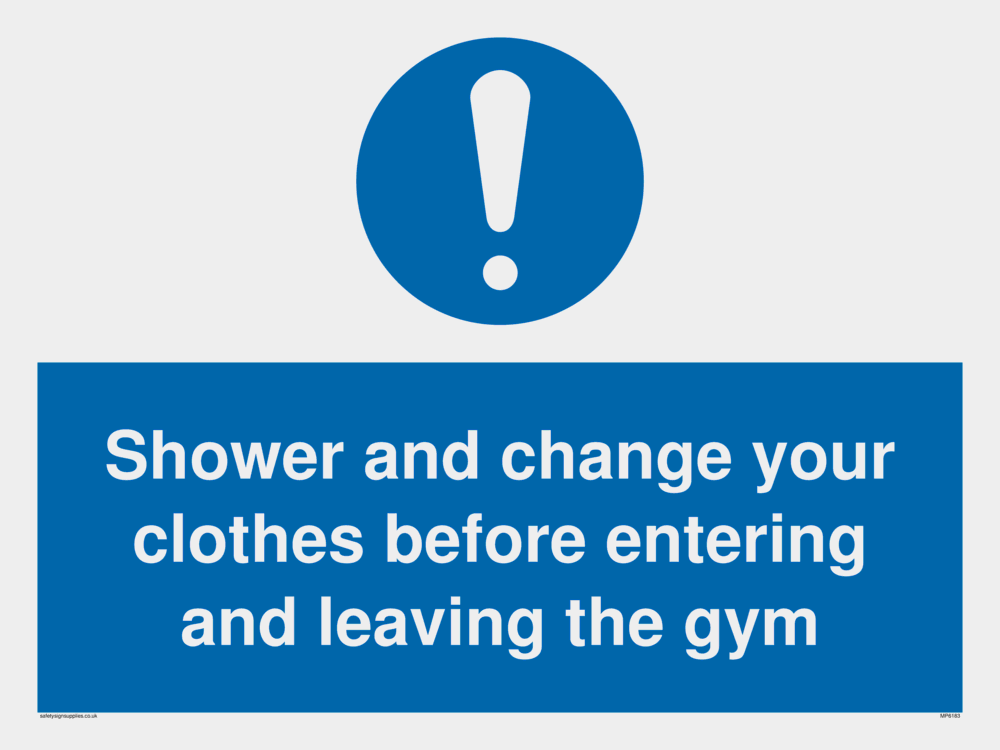 This sign contains a general Mandatory Exclamation Symbol - exclamation mark in white on blue circle background.