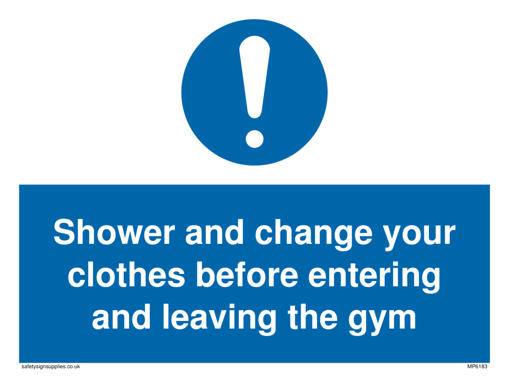 This sign contains a general Mandatory Exclamation Symbol - exclamation mark in white on blue circle background.