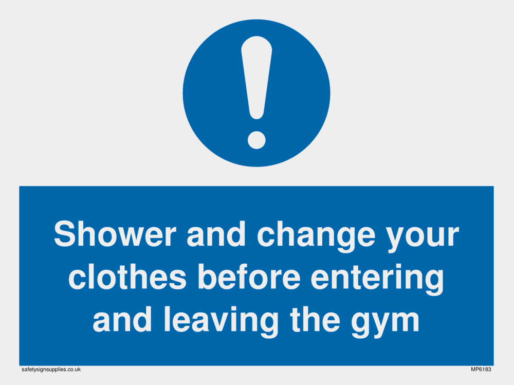 This sign contains a general Mandatory Exclamation Symbol - exclamation mark in white on blue circle background.