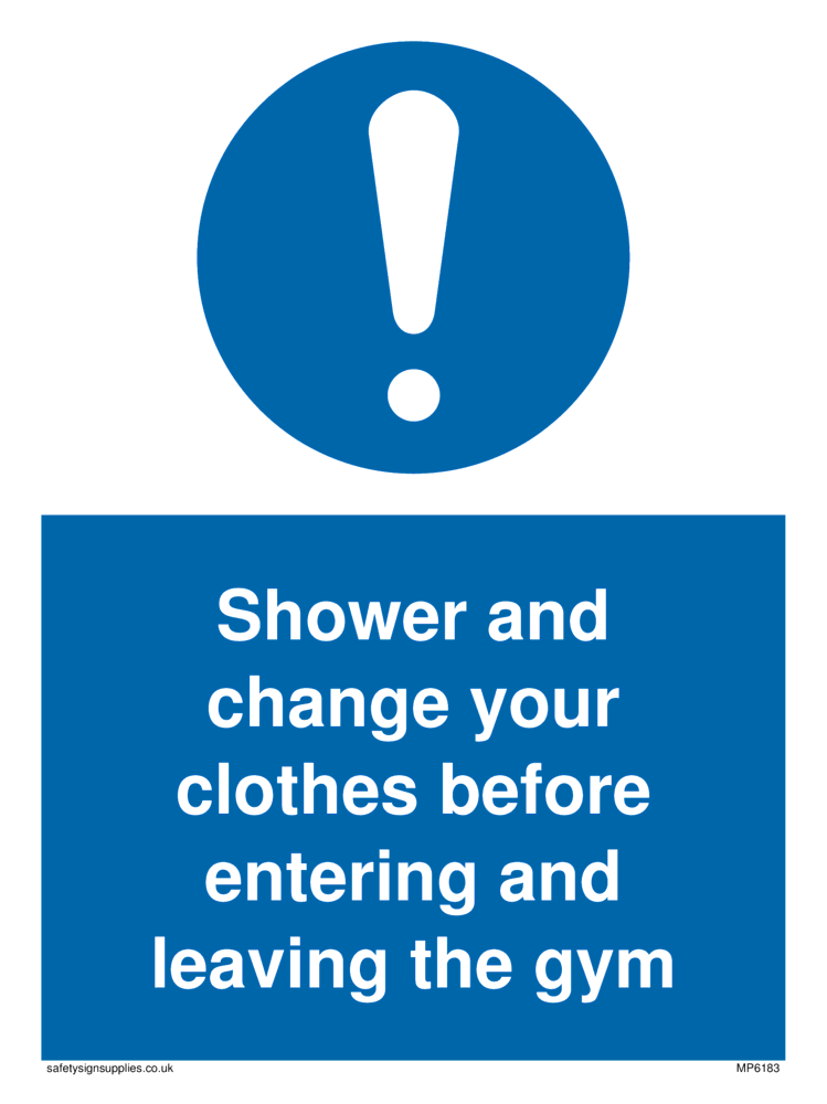 This sign contains a general Mandatory Exclamation Symbol - exclamation mark in white on blue circle background.