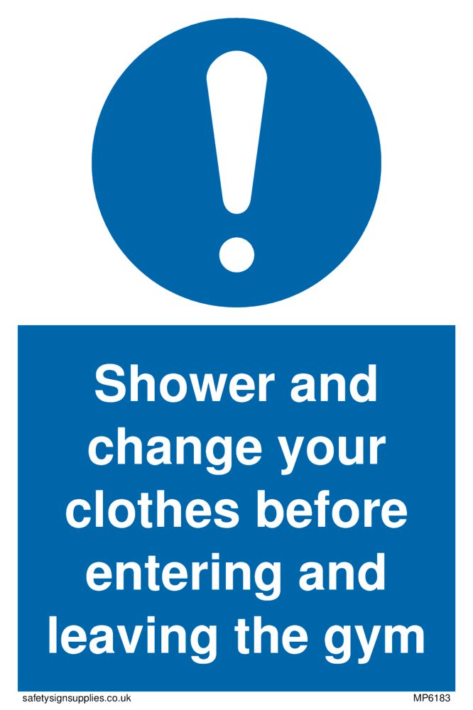 This sign contains a general Mandatory Exclamation Symbol - exclamation mark in white on blue circle background.