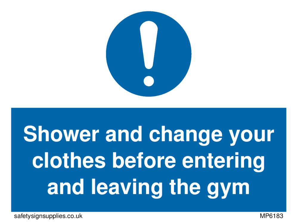 This sign contains a general Mandatory Exclamation Symbol - exclamation mark in white on blue circle background.