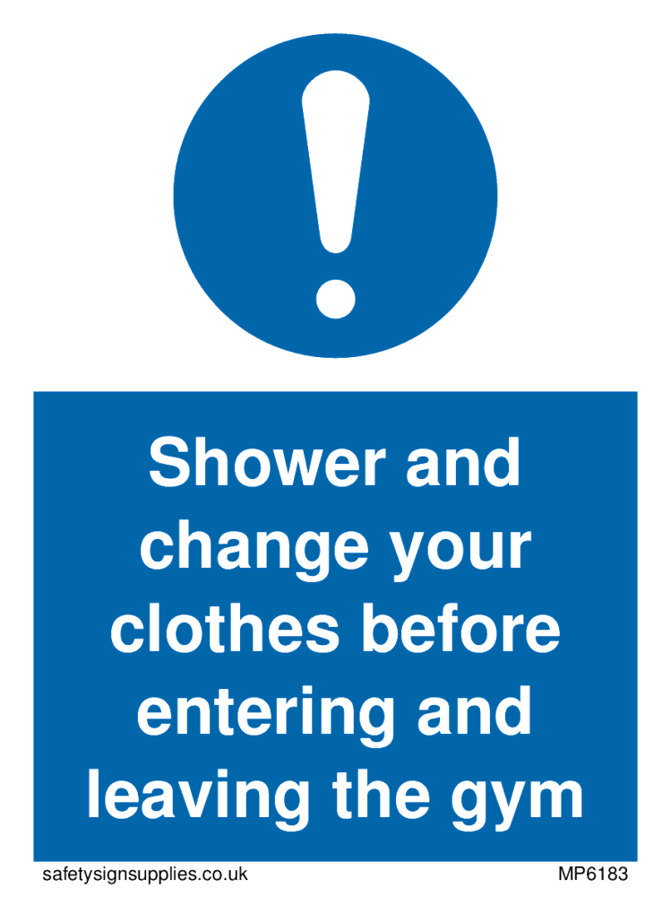 This sign contains a general Mandatory Exclamation Symbol - exclamation mark in white on blue circle background.