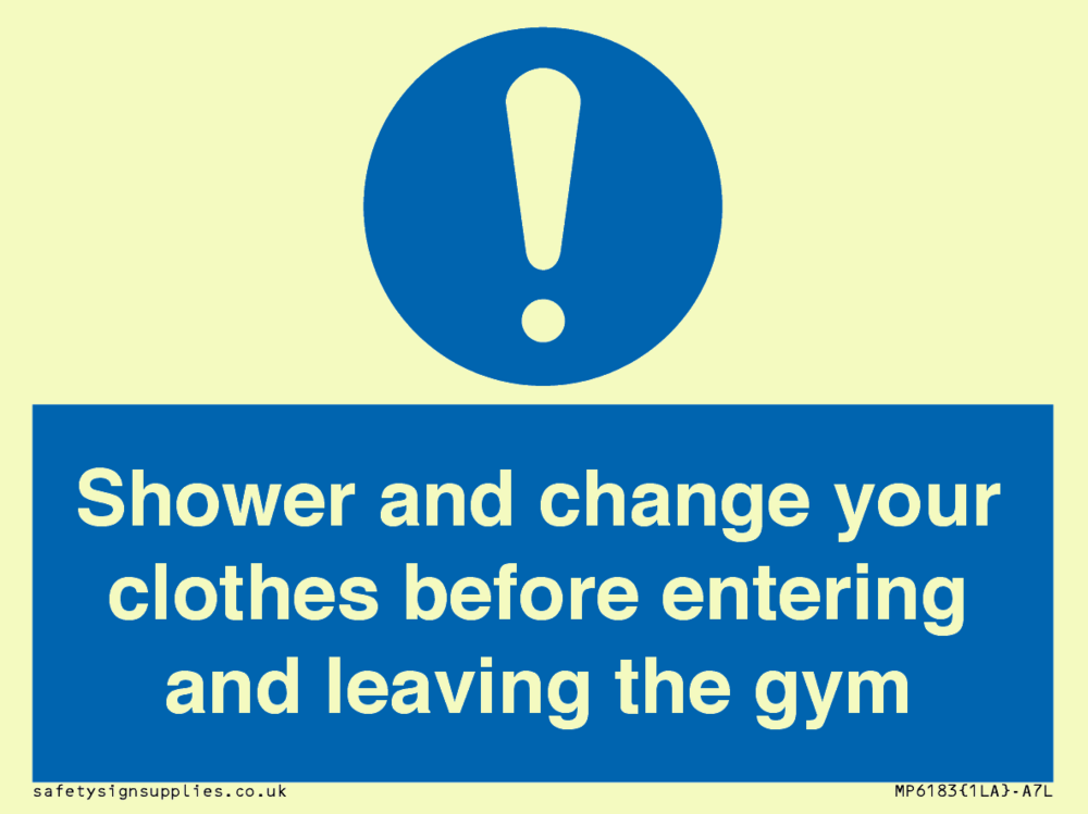 Sign Text: Shower and change your clothes before entering and leaving the gym