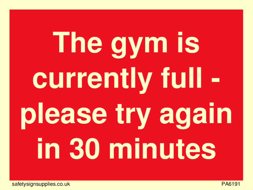 Sign Text: The gym is currently full - please try again in 30 minutes