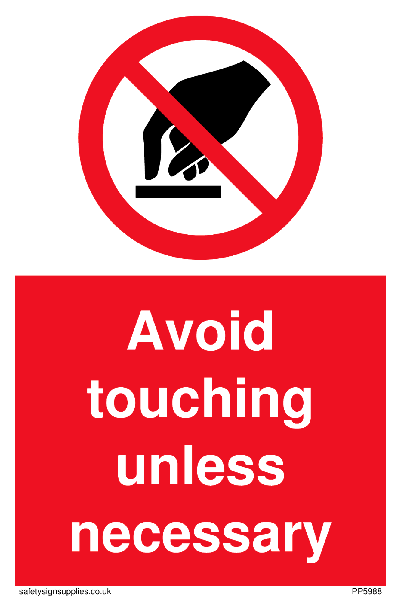 This sign contains a do not touch symbol - hand in black with red prohibition circle crossed through with diagonal line.