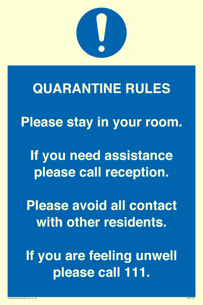 Quarantine Rules. Please stay in your room. If you need assistance please call reception. Please avoid all contact with other residents. If you are feeling unwell please call 111 Sign