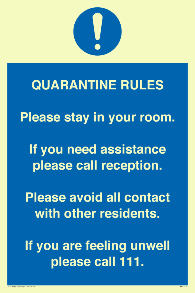 Quarantine Rules. Please stay in your room. If you need assistance please call reception. Please avoid all contact with other residents. If you are feeling unwell please call 111 Sign