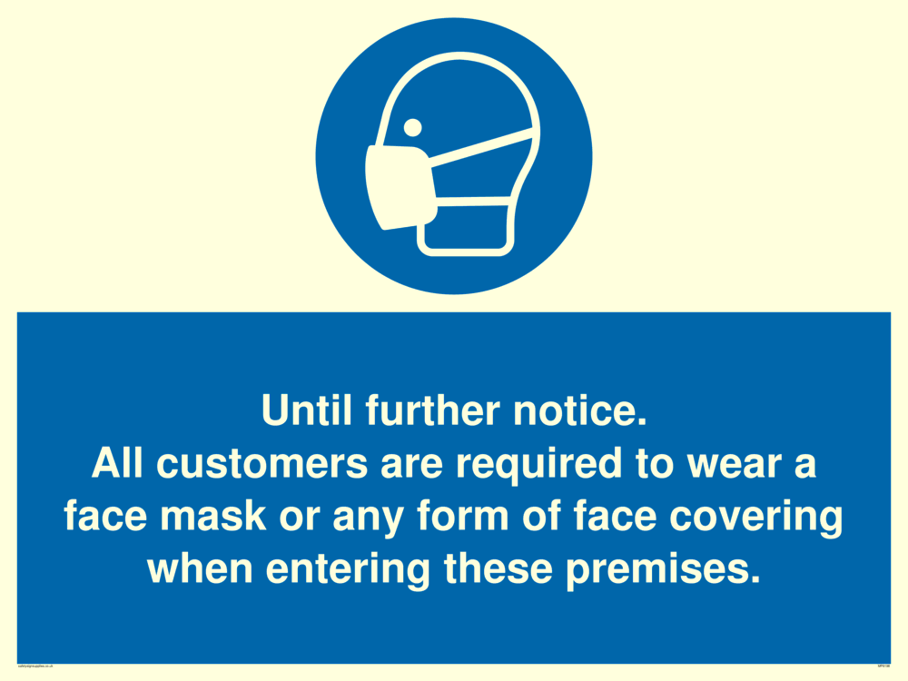 Until further notice. All customers are required to wear a face mask or any form of face covering when entering these premises. Sign