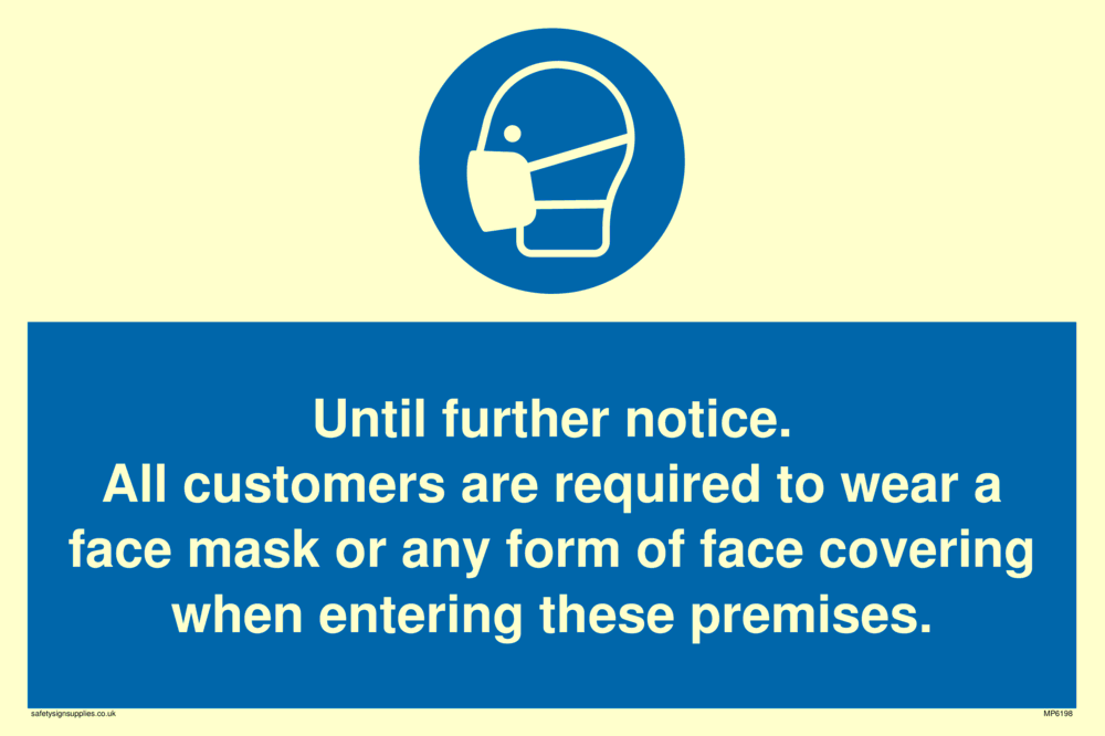 Until further notice. All customers are required to wear a face mask or any form of face covering when entering these premises. Sign