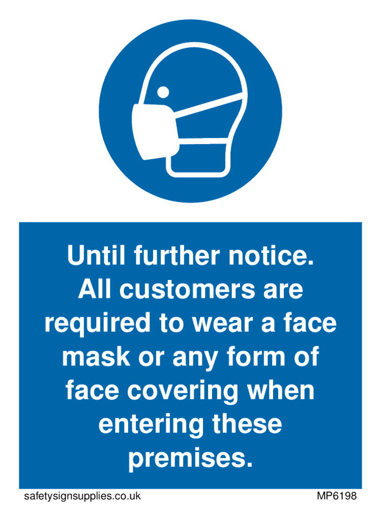 Until further notice. All customers are required to wear a face mask or any form of face covering when entering these premises. Sign