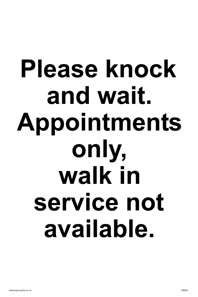 Sign Text: Please knock and wait. Appointments only, walk in service not available.