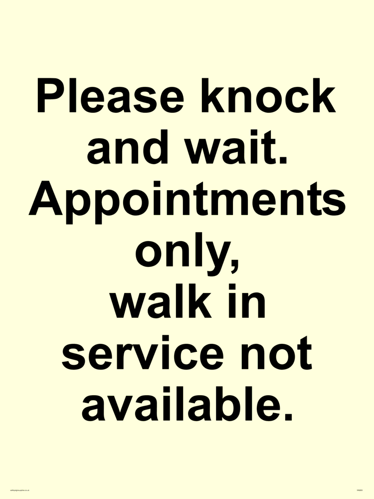 Please knock and wait. Appointments only, walk in service not available. Sign
